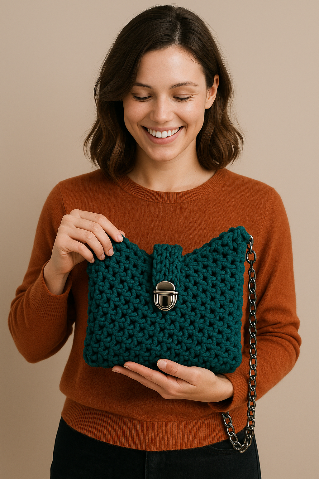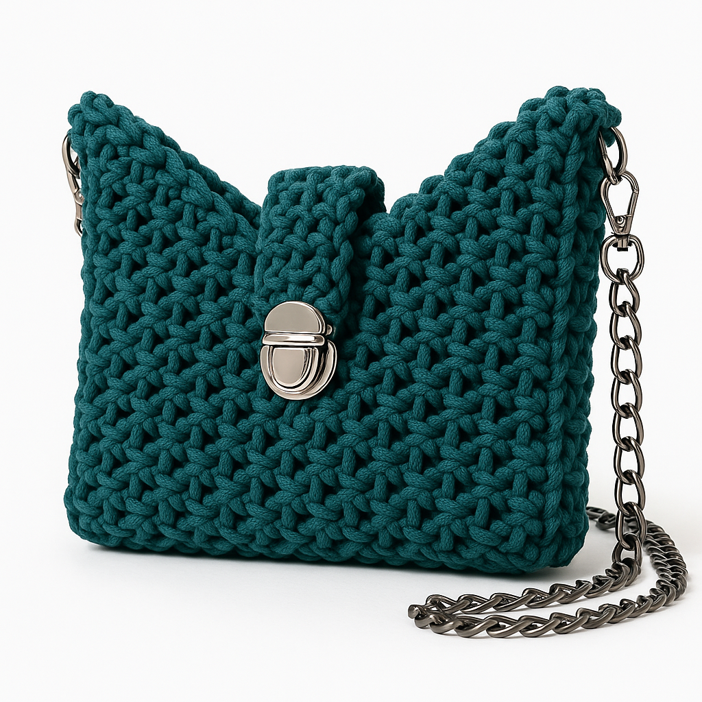 A beautifully handcrafted macrame crossbody sling bag featuring a tight, textured knot pattern and a premium metal chain strap. Made with rich, thick cotton cords in a deep teal shade, this piece brings together artisanal craft and modern chic styling. The sleek front flap with a metal turn-lock closure adds a touch of elegance, making it perfect for brunch dates, evening outings, or elevating everyday looks with a refined boho charm.